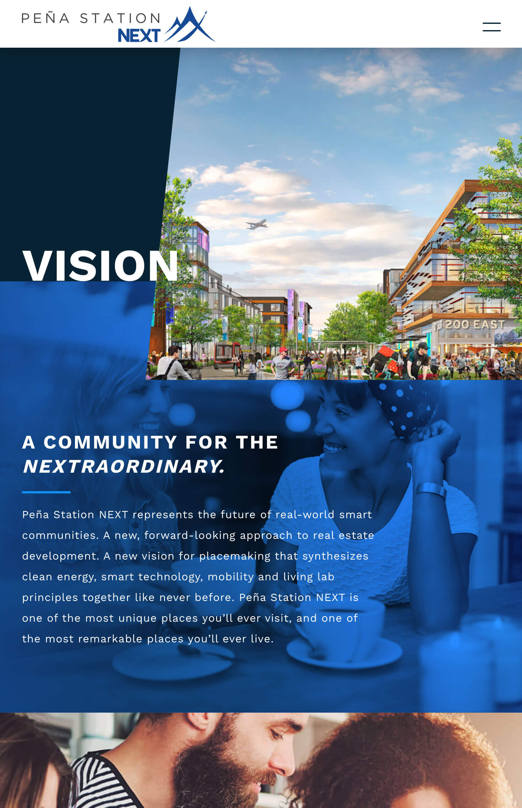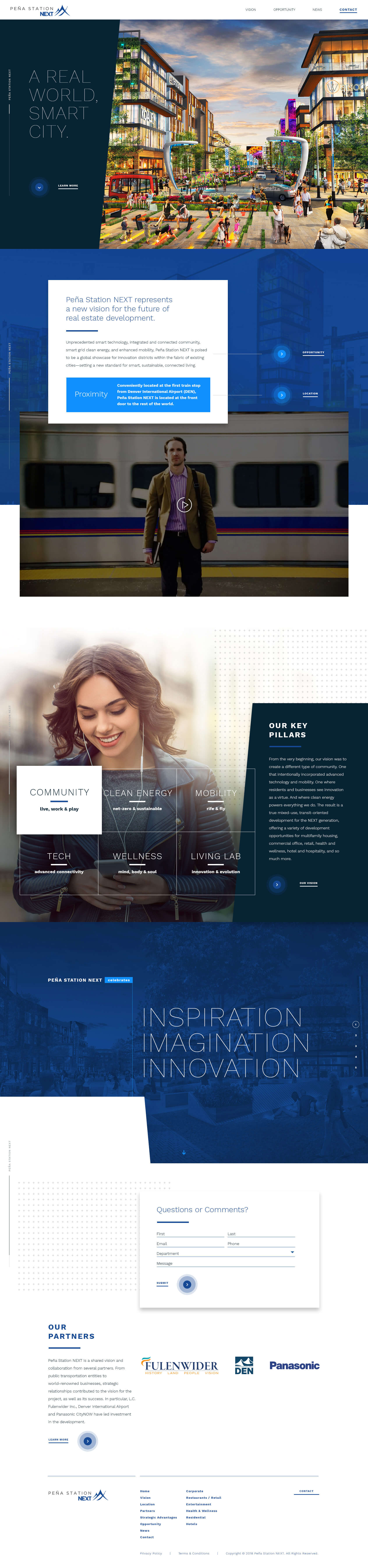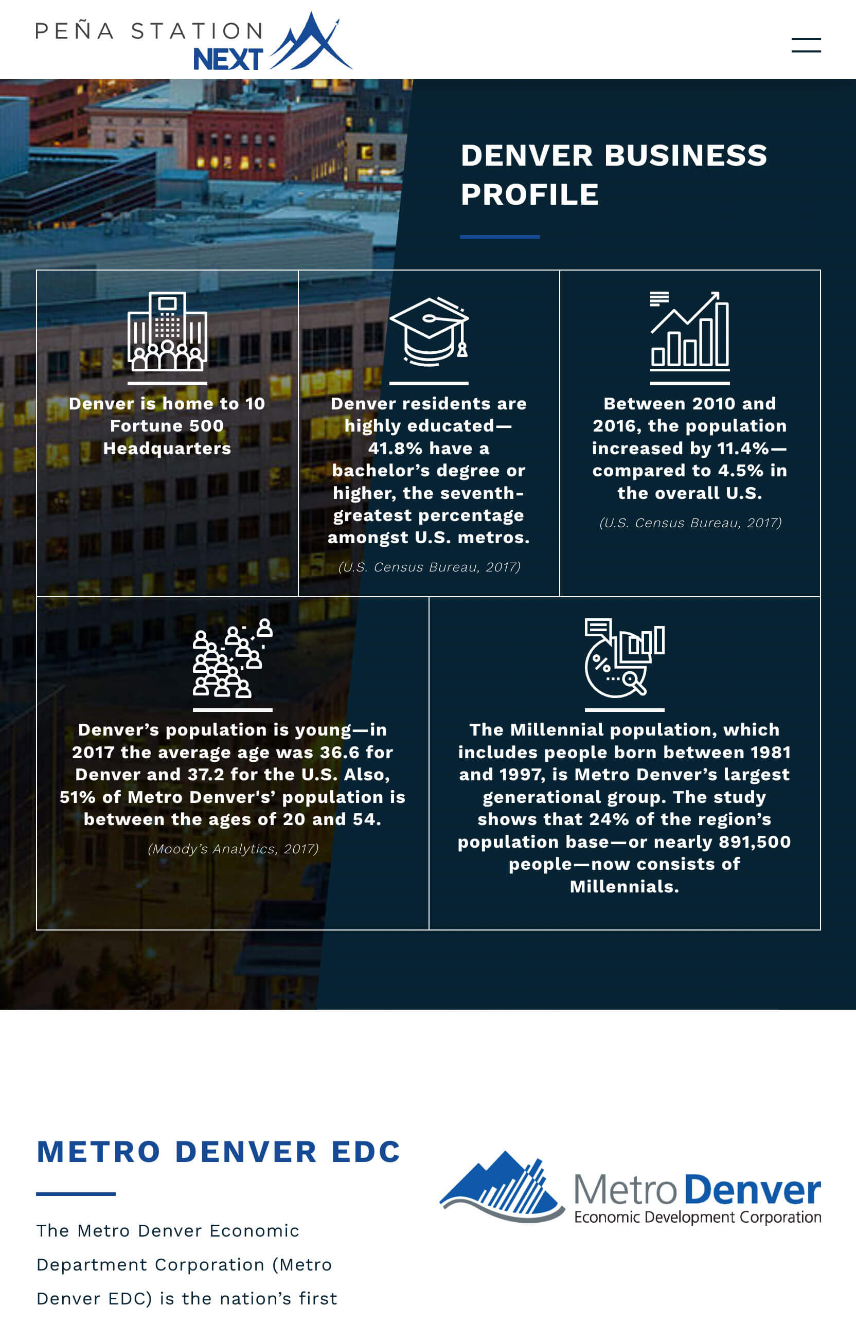 Smart City” because unlike other smart city concepts in Europe and Asia, Peña Station NEXT is a smart city “for the real world.” Next, we tackled the hero image and opted for an embedded 3-D rendered video of Peña Station NEXT as a property, provided by the architect. The video is hypnotizing and illuminating on what a dynamic place Peña Station NEXT will be at build-out.