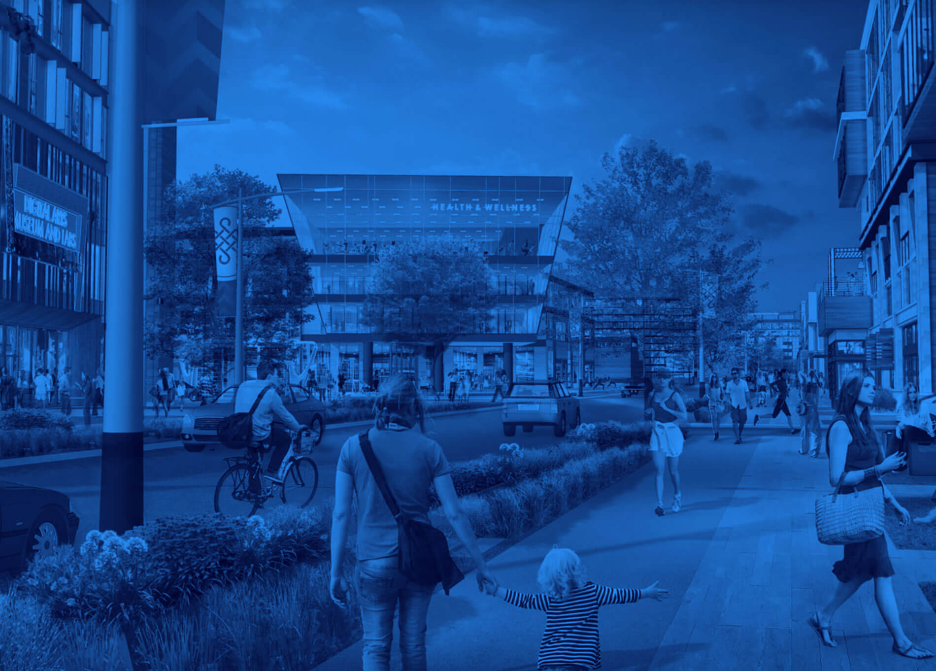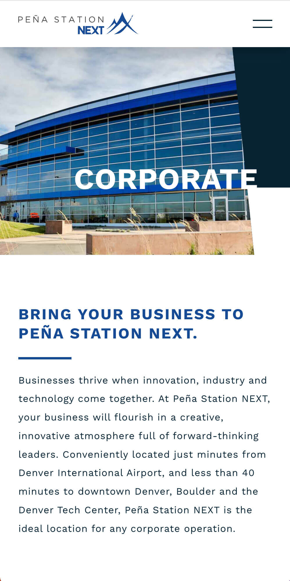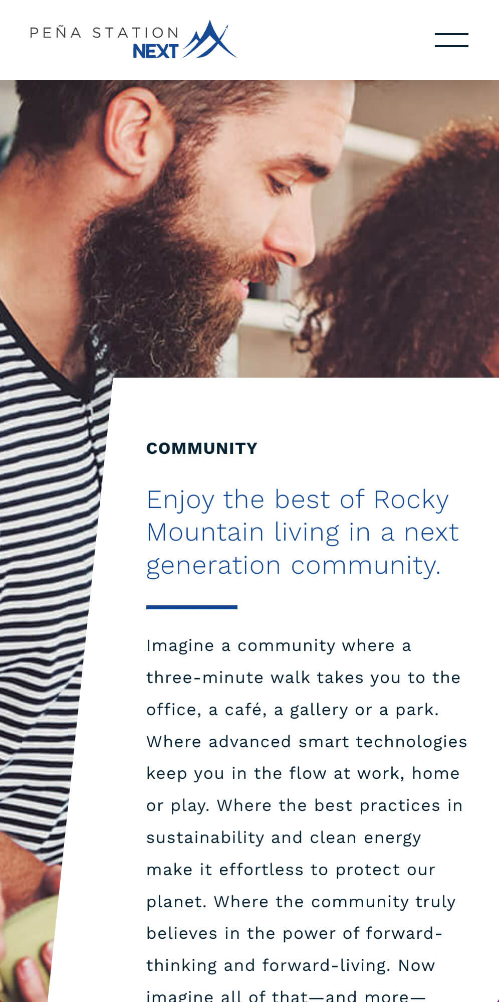 Smart City” because unlike other smart city concepts in Europe and Asia, Peña Station NEXT is a smart city “for the real world.” Next, we tackled the hero image and opted for an embedded 3-D rendered video of Peña Station NEXT as a property, provided by the architect. The video is hypnotizing and illuminating on what a dynamic place Peña Station NEXT will be at build-out.
