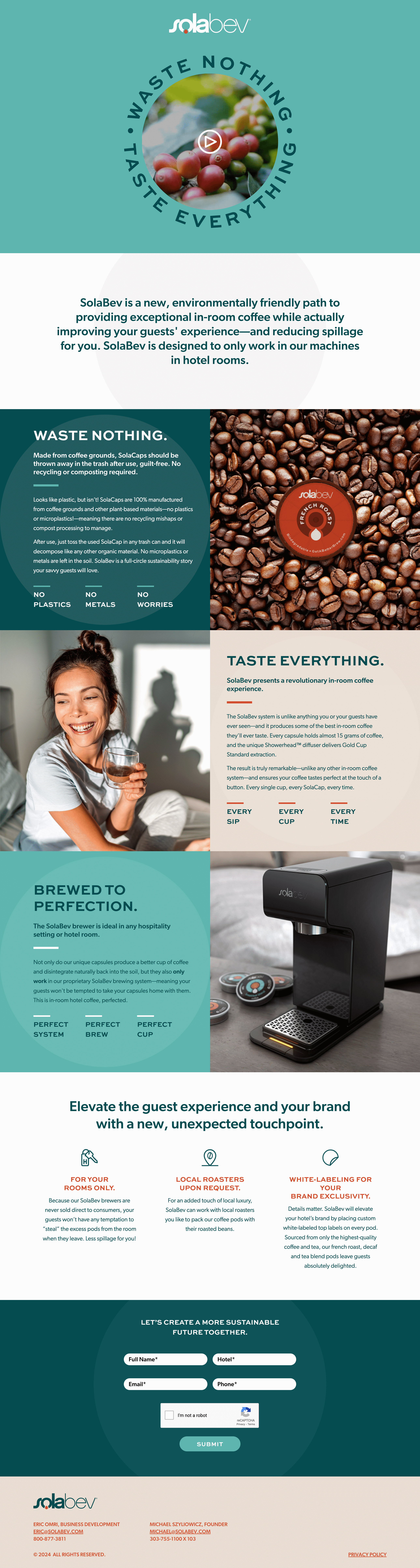SolaBev’s single-serve coffee system is a revolutionary, sustainable, in-room coffee program for the hospitality industry. With single-serve pods made from upcycled coffee grounds, SolaBev capsules decompose and disintegrate in weeks—not centuries—and leave nothing behind but organic material. SolaBev also features a proprietary brewer and pod design, which not only makes for a superior cup of coffee but also disincentivizes hotel guests from taking the coffee pods home with them to use in their own machines. SolaBev caps only work in SolaBev machines. Finally, because SolaBev is not mass produced, the company can partner with local roasters to fill its compostable pods, so that hoteliers can provide local, high-quality coffee for a more unique guest experience.