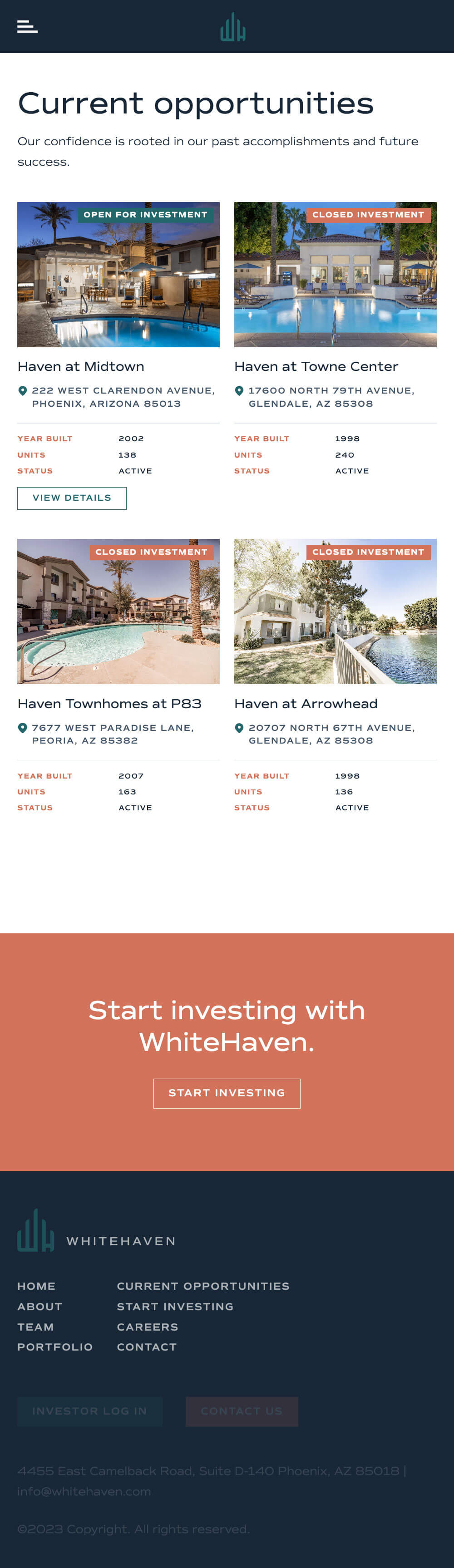 WhiteHaven, a private equity real estate investment firm, sought to revamp its B2B brand to better align with its institutional investors’ expectations. The primary goal was to establish a clear and recognizable brand identity that would not only support WhiteHaven, but also its subsidiary architectures and future growth. As a successful player in the industry, WhiteHaven aimed to maintain its position as a strong community partner as well as attract new clients and partners in the real estate industry. To achieve these goals, WhiteHaven needed a detailed branding strategy that would highlight its value and help expand its reach.